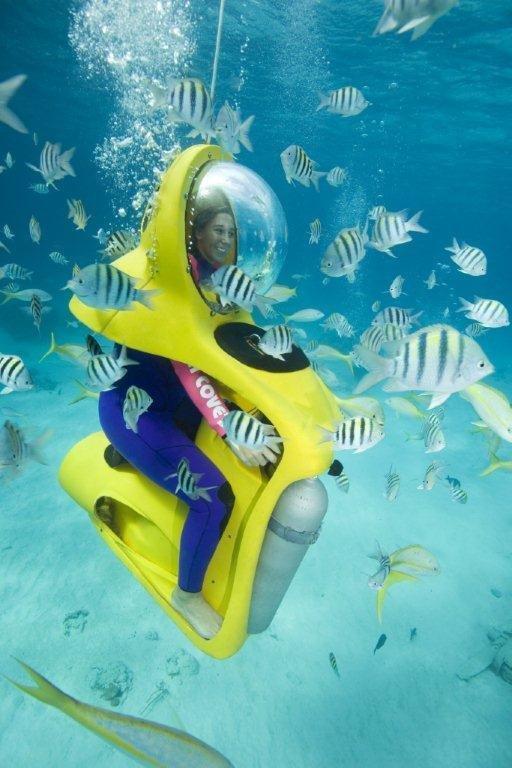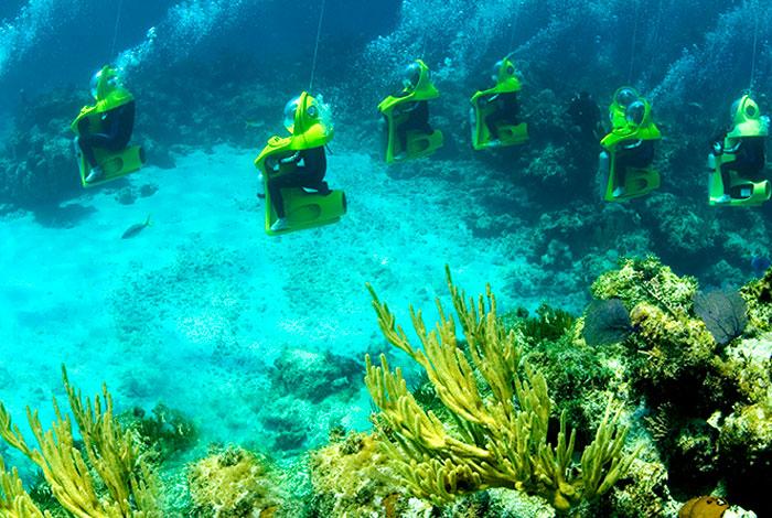 Descubre las maravillas del mundo submarino como nunca antes lo has hecho. Navega tu propio submarino mientras recorres el hermoso arrecife de coral de la zona y admiras los peces multicolor que nadan a tu alrededor. Utilizarás un domo que cubre por completo tu cabeza, permitiéndote respirar con normalidad mientras te encuentras en las profundidades del mar. Esto te dará libertad de explorar con tranquilidad la vida bajo el agua, con libertad y sin las preocupaciones del buceo. Una actividad perfecta para disfrutar con tu familia o en compañía de amigos.